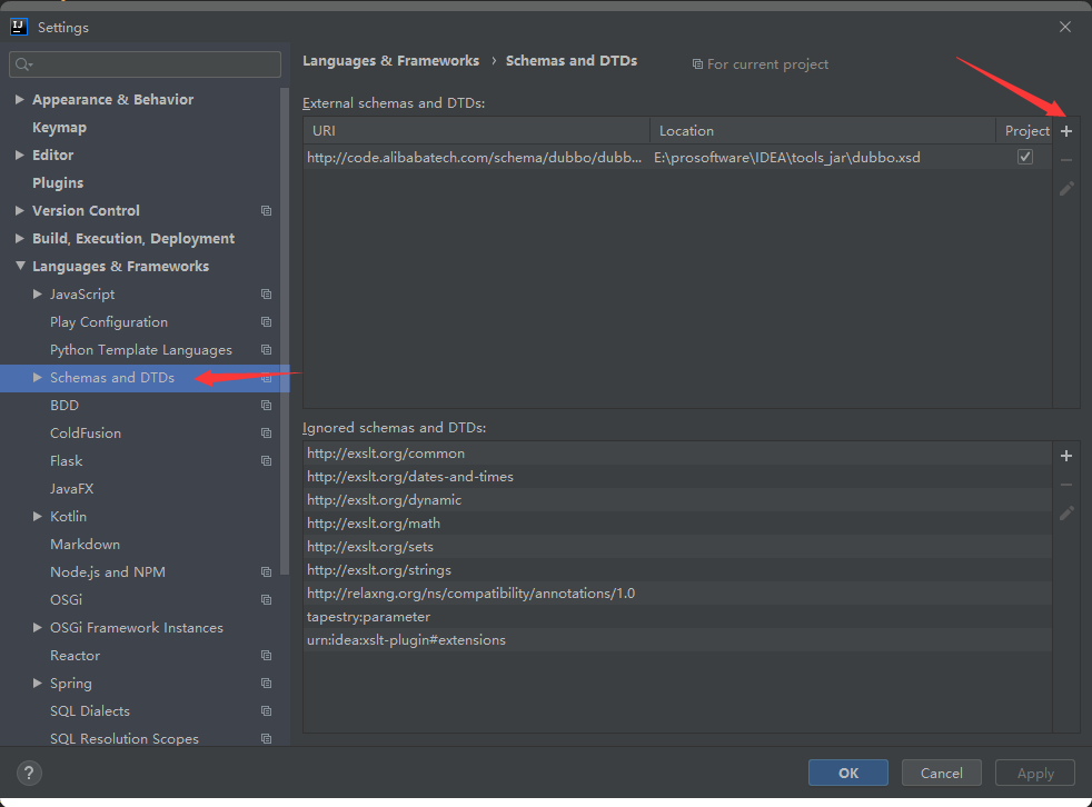 依次进入:Setting--->Languages & Frameworks--->Schemas and DTDs