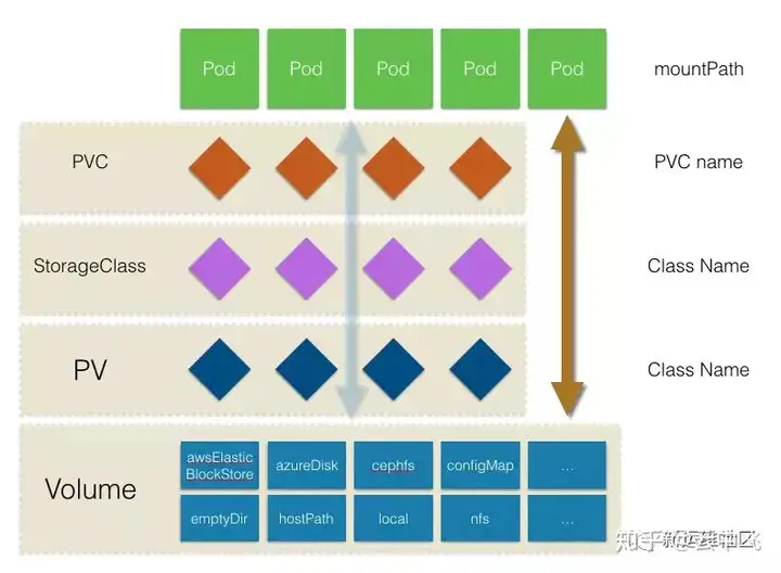 Kubernetes中存储中有四个重要的概念:Volume、PersistentVolume(PV)、PersistentVolumeClaim(PVC)、StorageClass。掌握了这四个概念,就掌握了Kubernetes中存储系统的核心。引用一张图来说明这四者之间的关系。