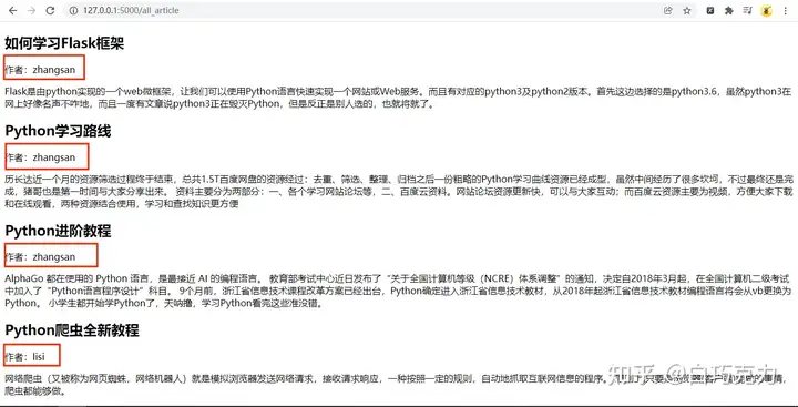 这个反向引用backref参数值user就很用有了,我们通过article.user获取user模型类对象,这样就有了user的属性了,再通过.username获取user中的username属性,这个属性也就是作者名了,在终端执行app.py,并在浏览器中打开http://127.0.0.1:5000/all_article,如下图所示: