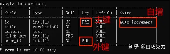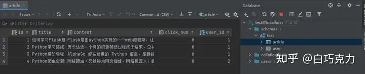 可以发现在user数据表中,没有articles字段,该字段是使用了db.relationship()方法,而不是使用db.Column()方法,所以不会在数据表中展示该字段,该字段作用是使模型类与模型类之间产生联系。