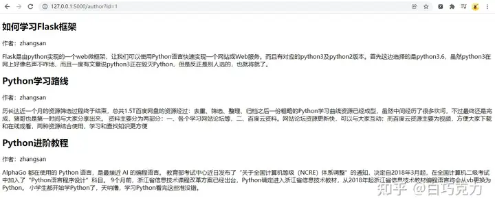 在终端执行app.py,并在浏览器中打开http://127.0.0.1:5000/author?id=1,如下图所示: