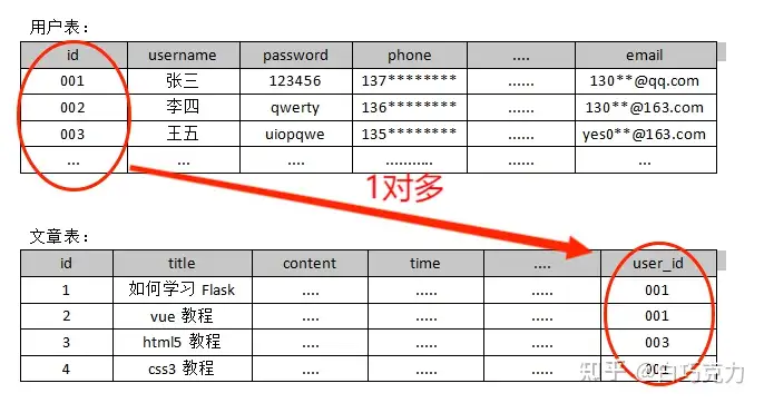 这里我们在文章表中增加一个user_id字段来标志是哪个用户发表的文章,当我们想要找出张三所发表的所有文章时,只需要在文章表中搜索user_id为001的数据并输出即可。