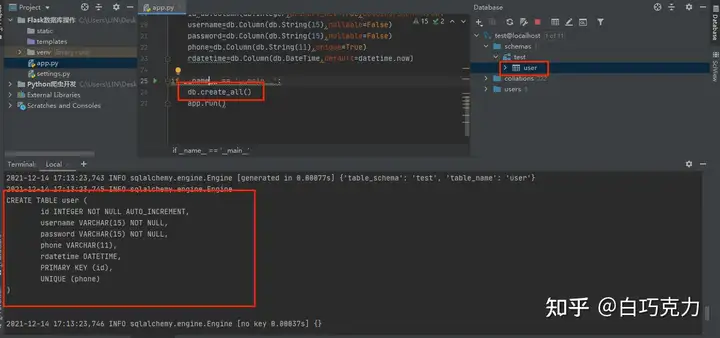db.create_all()方法将寻找所有db.Model的数据模型类,根据数据模型类创建数据表,这里我们只创建了一个数据模型类。我们在pycharm中通过数据库工具Database来观察数据库的变化,