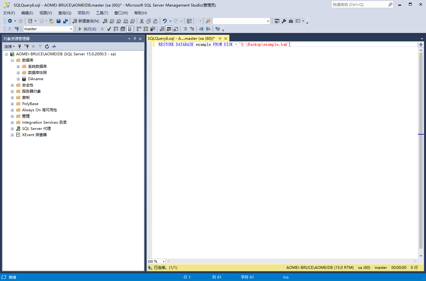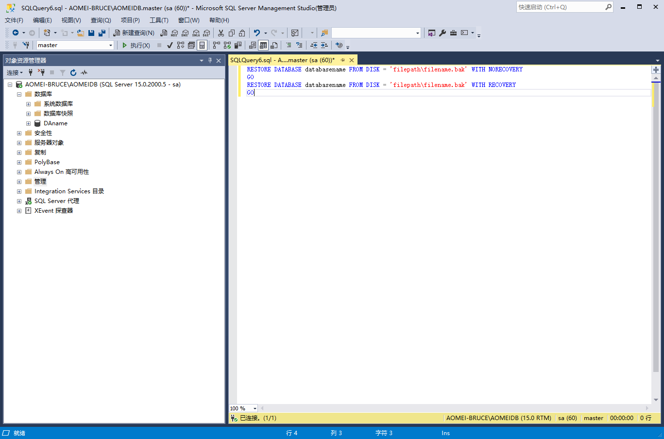 1. 连接到要将数据库还原到的实例。单击“新建查询”打开一个新窗口,然后输入以下 T-SQL 命令: