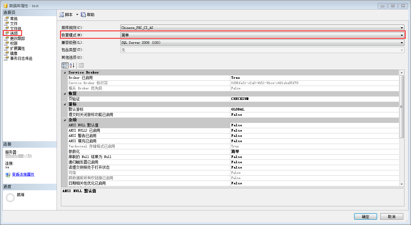 方法2:将数据库属性里面恢复模式更改为简单:简单模式将会保留最小的日志文件,在数据库属性,点击选项,恢复模式选择“简单”即可