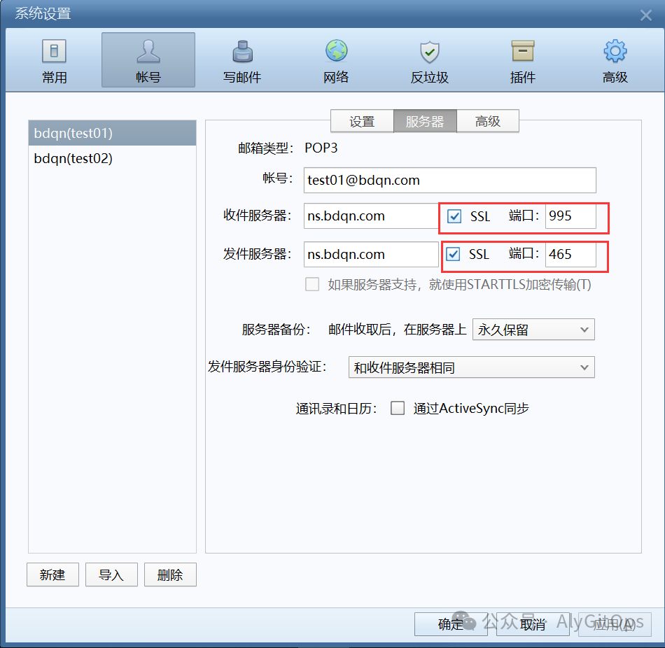- test01、test02都开启SSL端口分别为995、465