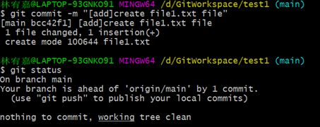 可以使用git status命令查看现在工作空间中已经没有东西可以提交,使用git log能够看到本次提交的记录。