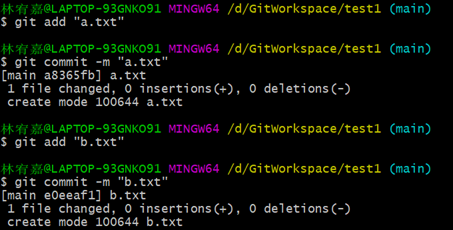 新建两个txt文件分别命名为a和b, 先将他们提交到缓存区再提交到本地仓库: