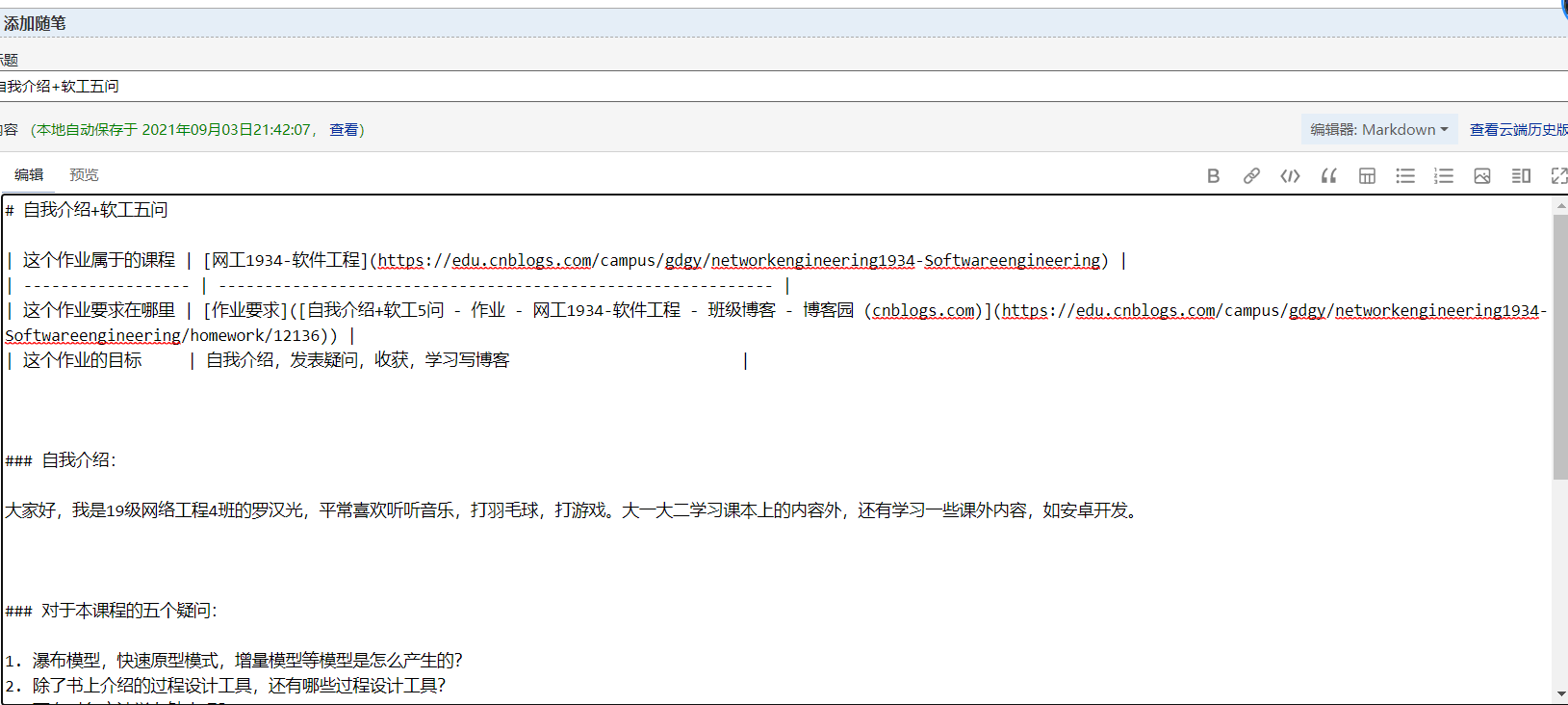 | 这个作业要求在哪里 | [作业要求](自我介绍+软工5问 - 作业 - 网工1934-软件工程 - 班级博客 - 博客园 (cnblogs.com)) |