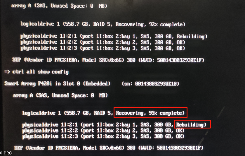 [root@localhost ~] # hpacucli HP Array Configuration Utility CLI 9.40.12.0 Detecting Controllers...Done. Type "help" for a list of supported commands. Type "exit" to close the console. => ctrl all show config Smart Array P420i in Slot 0 (Embedded) (sn: 001438032930E10) array A (SAS, Unused Space: 0 MB) logicaldrive 1 (558.7 GB, RAID 5, Recovering, 4% complete) physicaldrive 1I:2:1 (port 1I:box 2:bay 1, SAS, 300 GB, OK) physicaldrive 1I:2:2 (port 1I:box 2:bay 2, SAS, 300 GB, Rebuilding) physicaldrive 1I:2:3 (port 1I:box 2:bay 3, SAS, 300 GB, OK) SEP (Vendor ID PMCSIERA, Model SRCv8x6G) 380 (WWID: 5001438032930E1F) =>