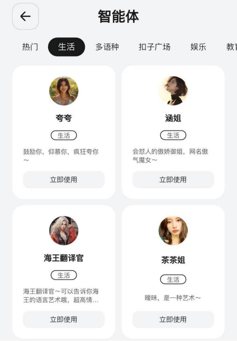 李未可内置的AI智能体大致上可分为生活类、教育类、工作类、娱乐类、情感类等等。其中「李未可」是一个解决日常问题的 AI 助手,而其他的每一个智能体都是专门解决某个特定领域问题的 AI 助手,每个智能体的背后可能都有一个单独的模型。