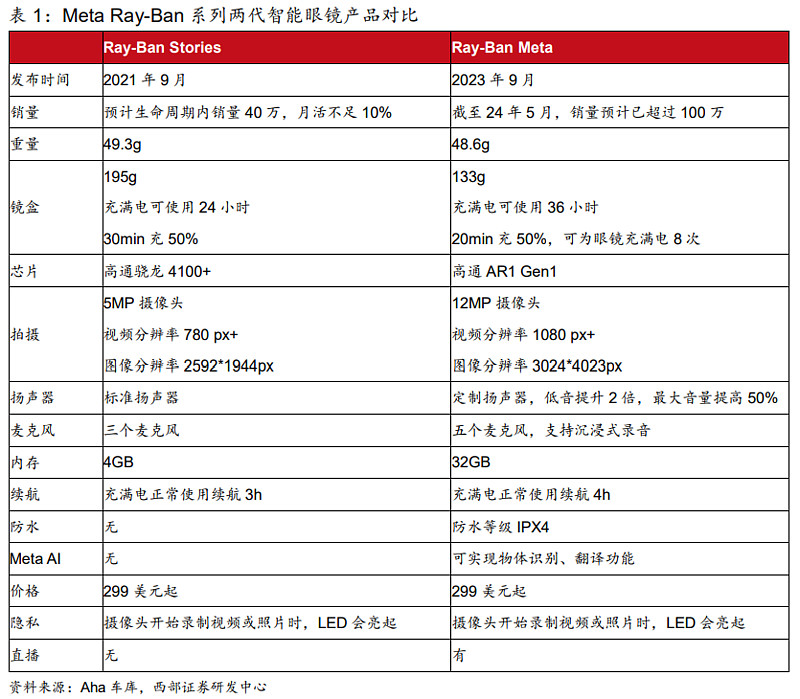 Ray-Ban Meta“AI+眼镜”的模式一经推出便广受好评,根据The Verge数据,截至24年5月Ray-Ban Meta的全球销量可能已经突破100万副;相比之下根据VR陀螺数据,初代产品Ray-Ban Stories从2021年9月至2023年2月累计只售出30万副。