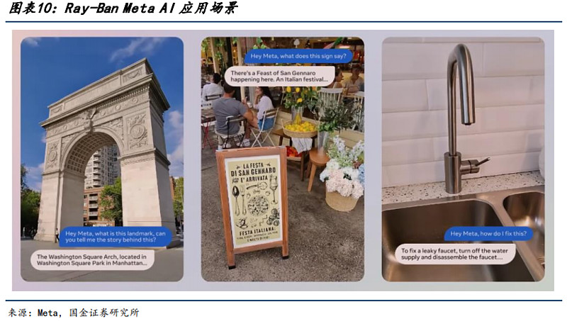 (1)AI功能:MetaAI是一个多模态人工智能,用户可以通过“Hey Meta”指令唤起AI,除了用于查询天气、时间、体育比赛、新闻结果等日常基础信息,用户还能通过“Hey Meta,look And...”指令调用摄像头以实现更多视觉化的操作,如你可以将眼镜摄像头对准冰箱,然后询问AI里面的食材可以用于做什么菜、如何穿搭衣服、识别眼前的建筑、询问花园中某种植物所需的浇水量等。此外Meta AI支持翻译功能,目前AI支持英语、西班牙语、意大利语、法语、德语五种语言。由于眼镜的AI能力需要基于云端实现,因而需要预留一定的响应时间。