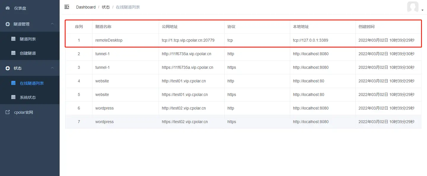 - 在“状态”“在线隧道列表”查看远程桌面的公网地址