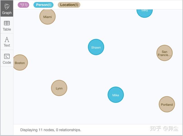 如图所示,共有6个人物节点、5个地区节点,Neo4J贴心地使用不用的颜色来表示不同类型的节点。