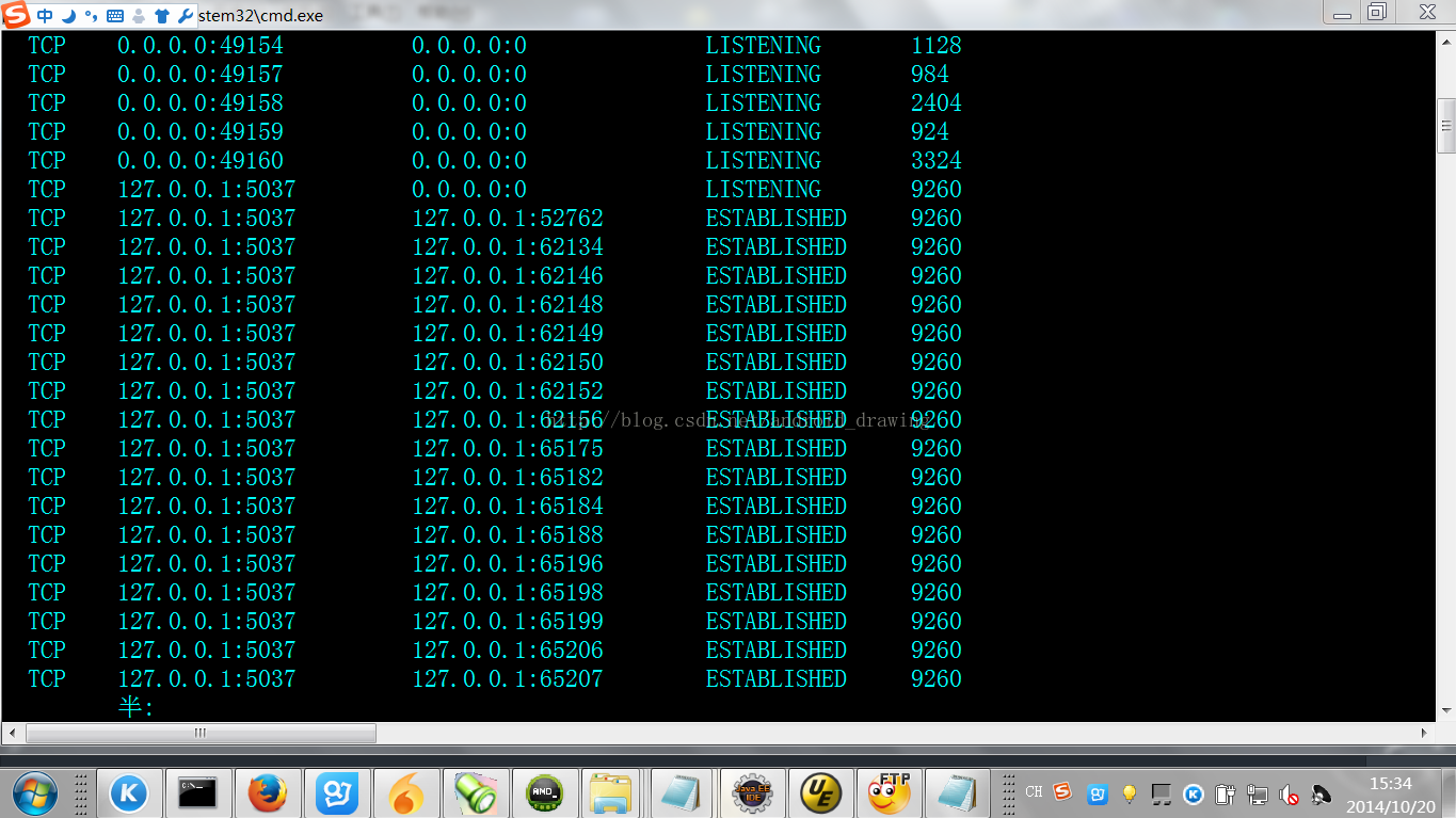 netstat -ano -> 查询本机的port占用情况,找到5037portlistening的PID;