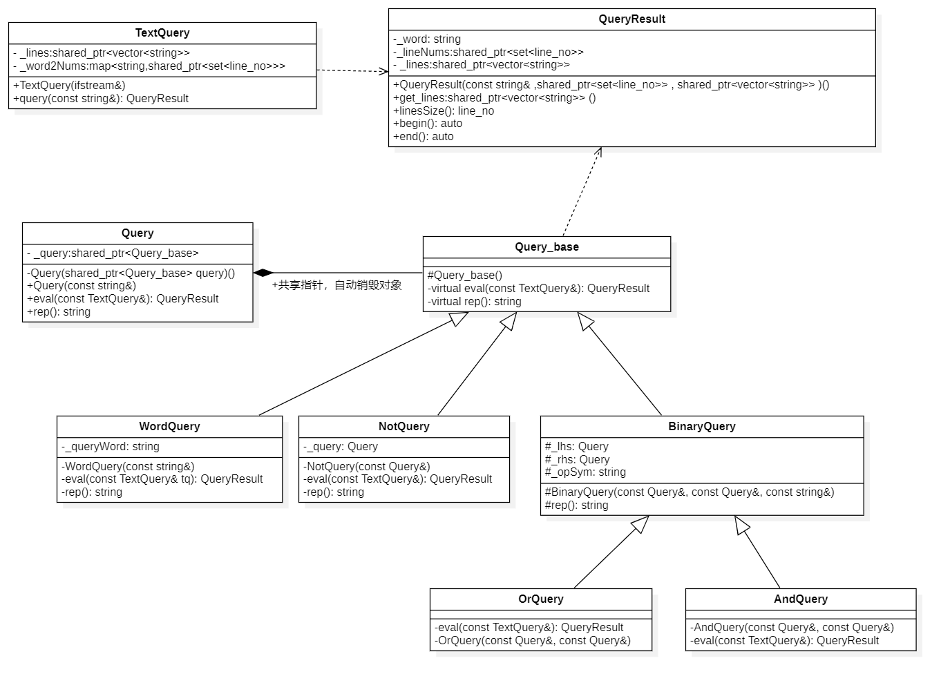 Query operator~(const Query& rhs) { return shared_ptr<Query_base>(new NotQuery(rhs)); } //==============与或查询派生类============= //与或查询的抽象基类,保存运算符左右两个运算对象 class BinaryQuery :public Query_base { protected: BinaryQuery(const Query& lhs, const Query& rhs, const string& op) :_lhs(lhs) , _rhs(rhs) , _opSym(op) {} //这个类不用覆盖eval string rep() const override { //因为都是string类型所以可以直接+ return "(" + _lhs.rep() + " " + _opSym + " " + _rhs.rep() + ")"; } protected: //派生类需要使用下面的数据成员,所以设置为protected Query _lhs; Query _rhs; string _opSym;//保存运算符 "|"、"&" }; //BinaryQuery主要提供rep的保存工作,并提供数据成员,其实这里不加这个BinaryQuery也可以, //只是BinaryQuery这种写法更对应面向对象的编程思想//这点很重要,要与C语言划清界限 //实际取交集返回QueryResult还得是AndQuery自己 //与运算 class AndQuery :public BinaryQuery { friend Query operator&(const Query& lhs, const Query& rhs); private: AndQuery(const Query& lhs, const Query& rhs)//构造函数 :BinaryQuery(lhs,rhs,"&") {} //覆盖eval,rep直接使用从BinaryQuery基类继承过来的即可 QueryResult eval(const TextQuery& tq) const override { //取两个集合的交集 QueryResult lRet = _lhs.eval(tq); QueryResult rRet = _rhs.eval(tq); //要动态分配哦 shared_ptr<set<line_no>> retLines = make_shared<set<line_no>>(); //取交集,调用标准库算法 set_intersection 来合并两个集合 set_intersection(lRet.begin(), lRet.end(),rRet.begin(), rRet.end(), inserter(*retLines, retLines->begin())); return QueryResult(rep(), retLines, lRet.get_lines()); } }; Query operator&(const Query& lhs, const Query& rhs) { return shared_ptr<Query_base>(new AndQuery(lhs, rhs));//递归 } //或运算 class OrQuery :public BinaryQuery { friend Query operator|(const Query& lhs, const Query& rhs); private: OrQuery(const Query& lhs, const Query& rhs)//构造函数 :BinaryQuery(lhs, rhs, "|") {} //覆盖eval,rep直接使用从基类BinaryQuery继承过来的即可 QueryResult eval(const TextQuery& tq) const override { //返回两个集合的并集 QueryResult lRet = _lhs.eval(tq);//继承的BinaryQuery的 _lhs与_rhs QueryResult rRet = _rhs.eval(tq); //取两个集合的并集 shared_ptr<set<line_no>> retLines = make_shared<set<line_no>>(lRet.begin(), lRet.end()); retLines->insert(rRet.begin(), rRet.end()); return QueryResult(rep(), retLines, lRet.get_lines()); } }; Query operator|(const Query& lhs, const Query& rhs) { return shared_ptr<Query_base>(new OrQuery(lhs, rhs)); } /***************************test************************************/ //这里的入栈与出栈的代码属于C语言风格,考验C基本功的时候到了... bool str2Query(const string str, Query& query) { //把用户输入的字符串变换成Query类型 stack<char> st4op; //用来解析表达式的栈,存储运算符 stack<Query> st4Query;//存储单词的栈 string word; //遍历str,借助两个栈来解析str for (auto elem : str) { if (isalpha(elem)) { word += elem;//string是可以加字符的 } else if (elem == '~') { if (word.size()) {//不为0说明左边有字母存在 //word1 ~ word2, 非法表达式,直接返回 cout << "'~'wrong expression!" << endl; return false; } st4op.push(elem); } else if (elem == '(') { //左括号,把'('压栈 st4op.push(elem); } else if (elem == '&') { if (word.size()) { //与运算,如果前一个是单词,压栈,并清空单词 query = Query(word);//动态调用 st4Query.push(query); word.clear(); if (st4op.empty()) { //word1 & word2 st4op.push(elem); continue; } if (st4op.top() == '&') { //如果是word1 & word2 & word3 st4op.pop(); query = st4Query.top(); st4Query.pop(); query = st4Query.top() & query; st4Query.pop(); st4Query.push(query); } else if (st4op.top() == '|') { //如果是word1 | word2 & word3 st4op.pop(); query = st4Query.top(); st4Query.pop(); query = st4Query.top() | query; st4Query.pop(); st4Query.push(query); } } //如果前面什么都没有,非法表达式,直接返回 else if (st4Query.empty()) { cout << "wrong exppression!" << endl; return false; } //如果前面是表达式 ( ... ) else if (st4op.top() == '&') { st4op.pop(); query = st4Query.top(); st4Query.pop(); query = st4Query.top() & query; st4Query.pop(); st4Query.push(query); } else if (st4op.top() == '|') { st4op.pop(); query = st4Query.top(); st4Query.pop(); query = st4Query.top() | query; st4Query.pop(); st4Query.push(query); } st4op.push(elem); } else if (elem == '|') { if (word.size()) { //或运算,如果前一个是单词,压栈,并清空单词 query = Query(word); st4Query.push(query); word.clear(); if (st4op.empty()) { //word1 | word2 st4op.push(elem); continue; } if (st4op.top() == '&') { //如果是word1 & word2 | word3 st4op.pop(); query = st4Query.top(); st4Query.pop(); query = st4Query.top() & query; st4Query.pop(); st4Query.push(query); } else if (st4op.top() == '|') { //如果是word1 | word2 | word3 st4op.pop(); query = st4Query.top(); st4Query.pop(); query = st4Query.top() | query; st4Query.pop(); st4Query.push(query); } } //如果前面什么都没有,非法表达式,直接返回 else if (st4Query.empty()) { cout << "wrong exppression!" << endl; return false; } //如果前面是表达式 ( ... ) else if (st4op.top() == '&') { st4op.pop(); query = st4Query.top(); st4Query.pop(); query = st4Query.top() & query; st4Query.pop(); st4Query.push(query); } else if (st4op.top() == '|') { st4op.pop(); query = st4Query.top(); st4Query.pop(); query = st4Query.top() | query; st4Query.pop(); st4Query.push(query); } st4op.push(elem); } else if (elem == ')') { //如果遇到右括号,弹栈 if (word.size()) { st4Query.push(Query(word)); word.clear(); } if (st4Query.empty()) { //非法表达式,直接返回 cout << "wrong exppression!" << endl; return false; } else { bool flag = false; while (!st4op.empty()) { //求出括号中的表达式 if (st4op.top() == '(') { //正确匹配