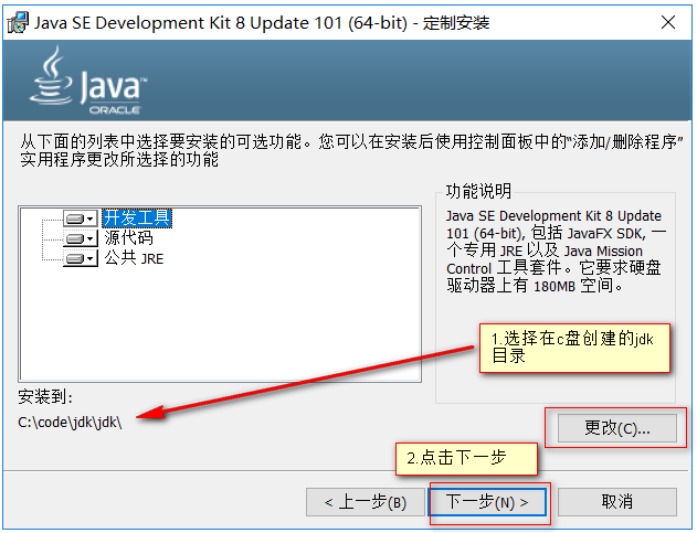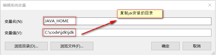 1. 在c盘目录下创建一个jdk文件2.进入到jdk中,分别创建jdk和jre两个文件夹3.开始安装jdk1.8 双击程序4.Next,点击下一步:5.更改jdk安装目录,点击下一步:6.安装中,等待7.选择jre安装目录,安装目录是之前创建的jre文件,点击下一步8.jre安装中,请耐心等待9.安装完毕,点击关闭10.配置环境变量:1.第一步:找到自己的控制面板,点击高级系统设置2.第二步:点击新建(w) 变量名:JAVA_HOME 变量值:jdk安装的目录3.找到path变量,点击新建,在文本框里面填写%JAVA_HOME%\bin4.通过dos命令 查看jdk是否安装成功:javac -version 看是否有javac 1.8_101出现,如果出现表示安装成功4.1HelloWorld入门程序