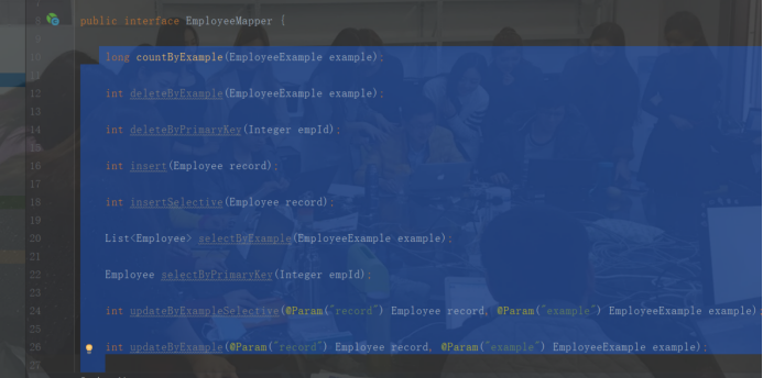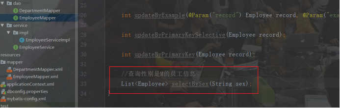 我们发现,帮我们生成了这么多方法,基本上单张表的所有操作都有。 一般情况,多张表的操作都是对应具体的业务逻辑。 我们写代码的时候,尽量把复杂的多张表的操作变成n个单张表的操作。 如果你觉得很复杂,没有办法拆,自己写一个方法,自己写对应的sql。然后调用自己的sql语句就可以了。 一、 调用dao中的一个方法