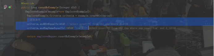 - 如果参数为 null ,直接执行 select count(*) from tbl_emp; - 如果参数不为空,会添加一个 where…. - select count (*) from tbl_emp where - 查询 did=16的 员工总数 - service 代码