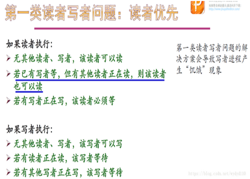 10、第一类读者写者问题的解决方案会导致写者进程产生“饥饿”现象。(T)