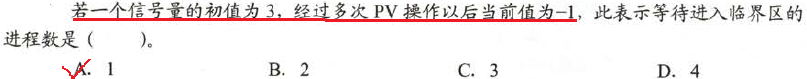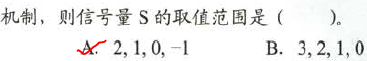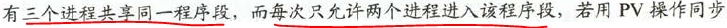 解析:程序段最多允许两个进程进入,则表示资源的数目为2,因此,信号量初值为2,每进入一个进程,信号量的值减1,当信号量的值减为0时,表示两个个进程均进入程序段,此时若再有一个进程请求进入执行P操作,则信号量的值减为-1,进程阻塞。