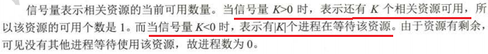 资源量<0,表示所有资源已经全部用完,而且还有进程正在等待使用资源,等待的进程数就是资源量的绝对值