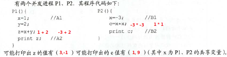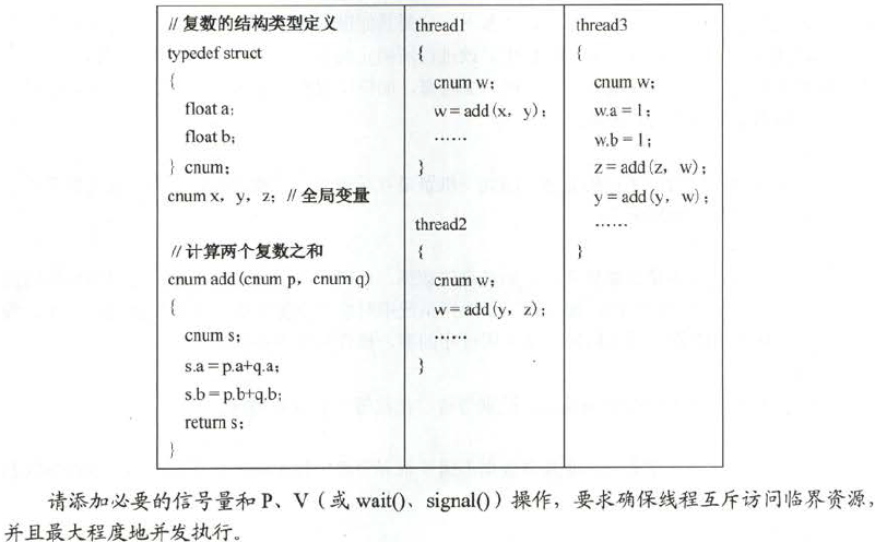 //复数的结构类型定义 typedef struct{ float a; float b; }cnum; cnum x,y,z;//全局变量 //计算两个复数之和 cnum add(cnum p, cnum q) { cnum s; s.a = p.a + q.a; s.b = p.b + q.b; return s; } thread1 { cnum w; P(mutex_y13); w = add(x,y); V(mutex_y13); ...... } thread2 { cnum w; P(mutex_y23); P(mutex_z); w = add(y,z); V(mutex_y23); V(mutex_z); ...... } thread3 { cnum w; w.a = 1; w.b = 1; P(mutex_z); z = add(z,w); V(mutex_z); P(mutex_y13); P(mutex_y23); y = add(y,w); V(mutex_y13); V(mutex_y23); ...... }