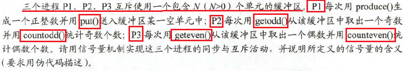 semaphore mutex = 1; //缓冲区操作互斥信号量 semaphore odd = 0,even = 0; //奇数,偶数进程的同步信号量 semaphore empty = N; Process P1(){ while(True){ x = produce(); //生成一个数 P(empty); //看缓冲区是否有空闲单元 P(mutex); //有就提出占用 Put(); //把数送入缓冲区空单元 if(x%2==0) V(even); //如果是偶数,向P3发出信号 else V(odd); //如果是奇数,向P2发出信号 } } Process P2(){ while(True){ P(odd); //收到P1发来的信号,然后去取奇数 P(mutex); //占用一下缓冲区 getodd(); V(mutex); //释放缓冲区 V(empty); //向P1发出信号,多出了一个空单元 countodd(); } } Process P3(){ while(True){ P(even); P(mutex); geteven(); V(mutex); V(empty); counteven(); } }
