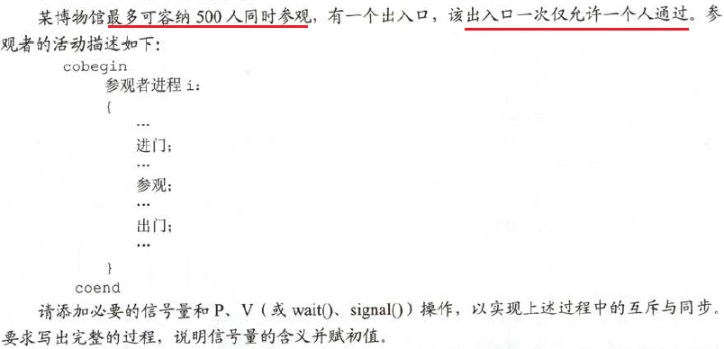 博物馆最多可同时容纳500人,设置信号量empty,初始值为500