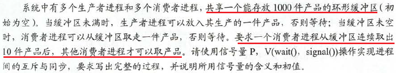 semaphore mutex1 = 1; semaphore mutex2 = 1; semaphore empty = 1000; semaphore full = 0; producer(){ while(1){ 生产一个产品; P(empty); //看缓冲区有无空位,有就申请一个 P(mutex2); //互斥访问缓冲区 把产品放入缓冲区; V(mutex2); //释放缓冲区 V(full); //产品的数目+1 } } consumer(){ while(1){ P(mutex1) //占用缓冲区,连续取10次 for(int i = 0; i < 10; i++){ P(full); //看缓冲区有无产品,有就取 P(mutex2); //每次互斥占用缓冲区 从缓冲区取出一件产品 V(mutex2); //取完就释放缓冲区 V(empty); //缓冲区空位+1 消费这件产品; } V(mutex1) } }