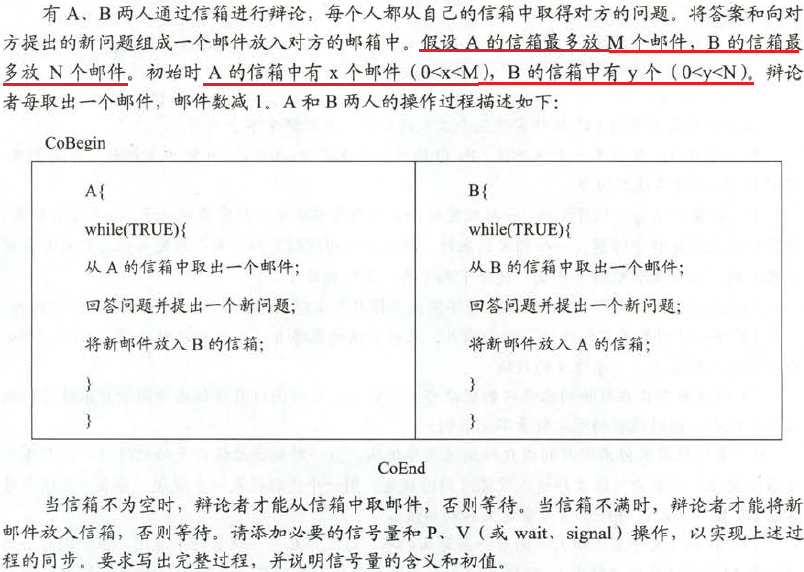 mutex_A = 1 mutex_B = 1 empty_A = M-x empty_B = N-y full_A = x full_B = y A{ while(TRUE){ P(full_A); V(mutex_A); 从A的信箱中取出一个邮件 V(mutex_A); V(empty_A); 回答问题并提出一个新问题 P(empty_B); P(mutex_B); 将邮件放入B的信箱 V(mutex_B); V(full_B); } } B{ while(TRUE){ P(full_B); V(mutex_B); 从B的信箱中取出一个邮件 V(mutex_B); V(empty_B); 回答问题并提出一个新问题 P(empty_A); P(mutex_A); 将邮件放入A的信箱 V(mutex_A); V(full_A); } }