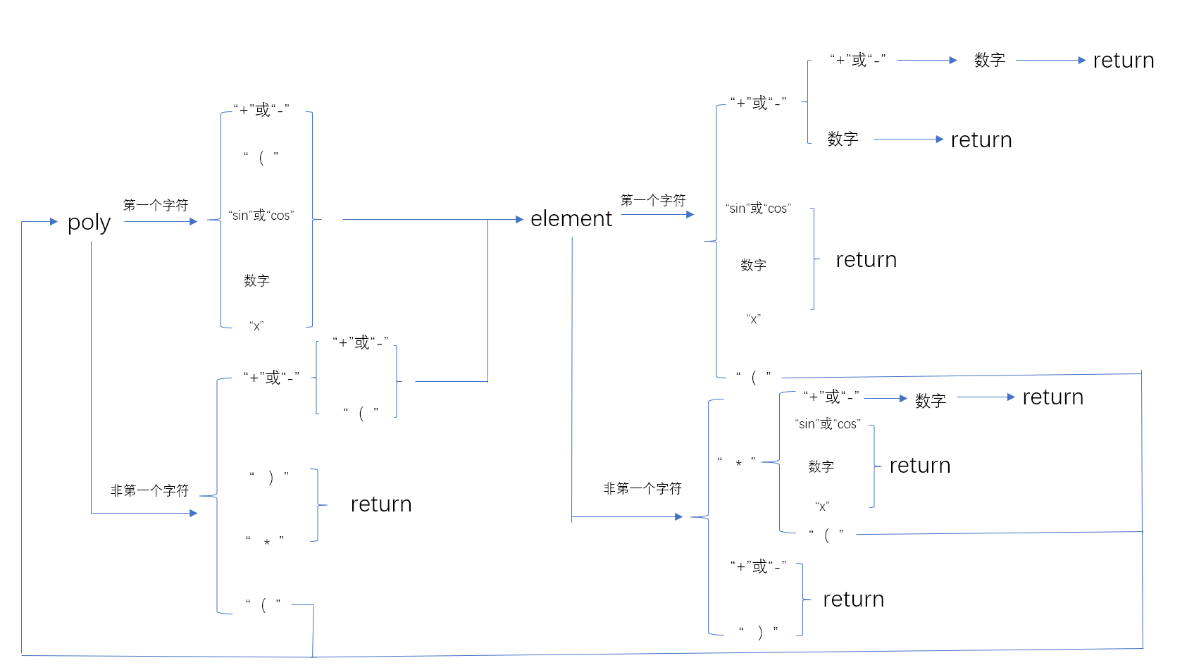为了保留第二次作业的求导功能,第三次作业选择了判断表达式合法性和表达式求导分离的 方法,新建了判断表达式合法性的判断类,使用类似递归下降分析的方法使用递归函数判断表达式的合法性,符合规范的表达式再进行求导。与第二次求导不同的是,第三次作业中对三角函数的求导进行了重构,三角函数内部当作新的表达式递归求导,输出方式与第二次相同。