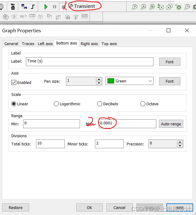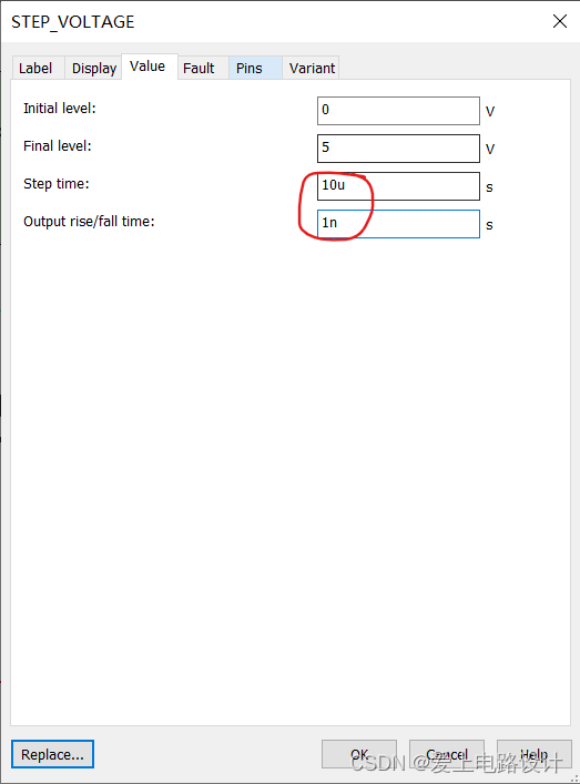 设置L1 = 1uH,C1=10nF,R1分别为1Ω、10Ω、20Ω、100Ω。原文件下载:过阻尼、临界阻尼、欠阻尼, 采用Multisim仿真(Multisim14.2仿真使用汇总)。Vin为Step Voltage,设置如下图。