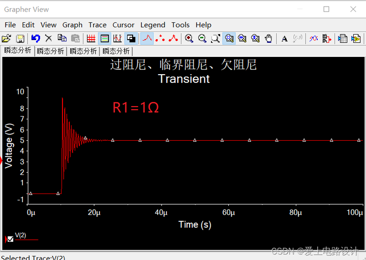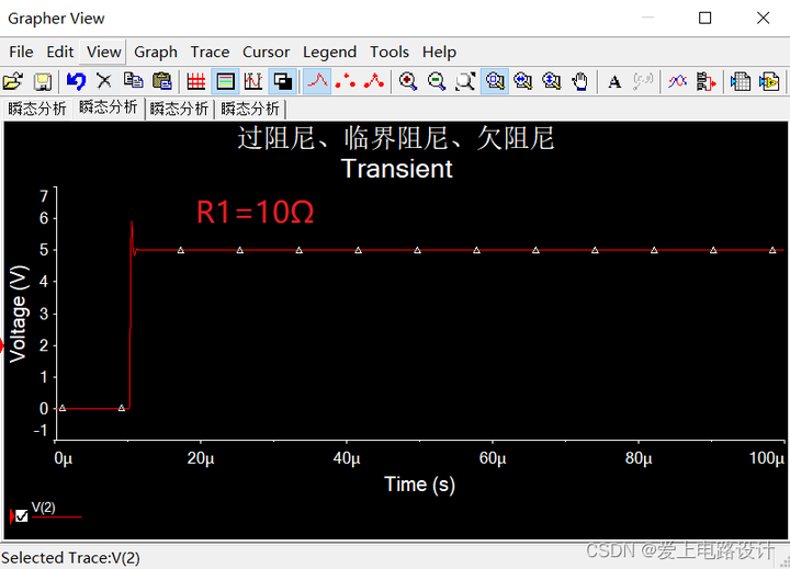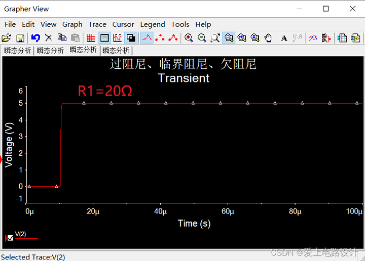 (2)R = 2√L/C时,处于临界阻尼状态,系统处于临界阻尼状态,此时系统也不会振荡。上升时间比过阻尼状态更短。