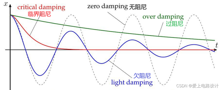 根据阻尼系数ζ的不同,阻尼振荡状态可以分为:过阻尼、临界阻尼、欠阻尼。