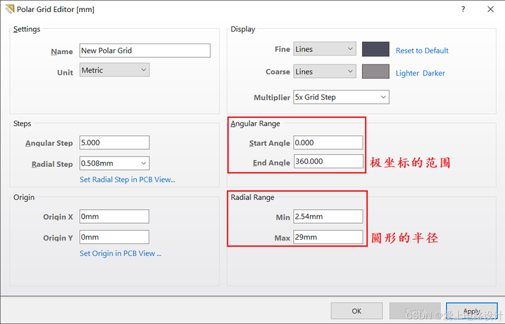 “Angular Range”用于设置极座标的范围,比如90°,如下图所示。
