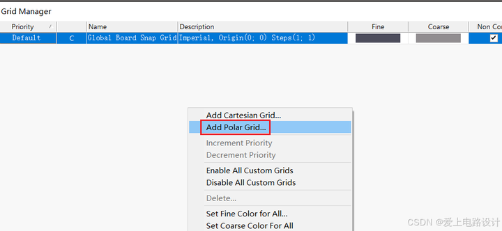 3、在“Grid Manager”对话框下点击“Add Polar Grid”,用于添加极座标。