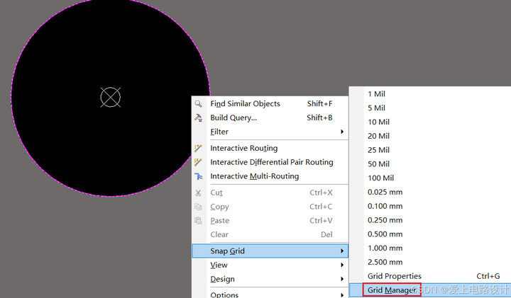 2、在线路板的空白处右键,选择Grid Manager,如下图所示。