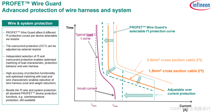 另外英飞凌还推出了 PROFET Wire Guard 系列,它集成 I²t 线束保护和低功耗空闲模式为现代配电中的线束保护需求提供了汽车智能高边开关的解决方案。