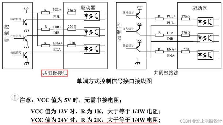 驱动器CL86D 的 PUL+ 与 DIR+ 建议通过 2K/0.25W电阻串联接到 24V电源,采用如图1.4 的共阳极接法。