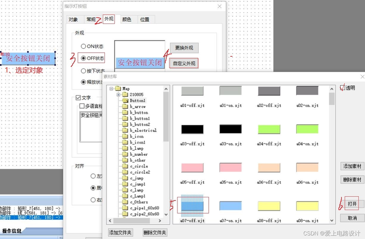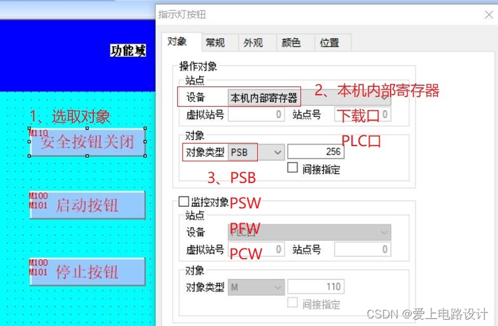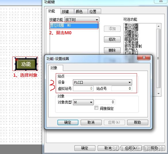 若新建的程序通讯正常,用户就需要要检查工程画面中的内容,尤其是按钮、数据输入等与通讯设备有关的部件,检查这些部件所选择的设备、站号是否正确。例如:人机界面与信捷 PLC 通讯,PLC的站号为1,并通过电缆与人机界面的 PLC 口连接。然后在编辑画面上,添加了一个对 PLC 内的软元件 M0 置位的按钮,那么这个按钮的“站点号”就要设置为 1,“设备”栏选择 PLC 口。