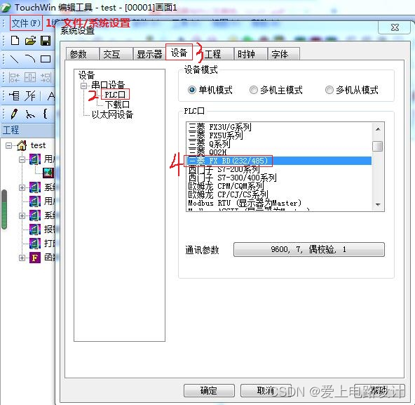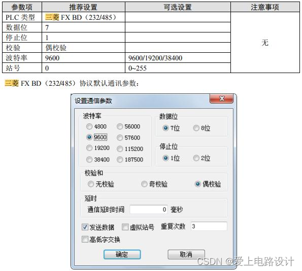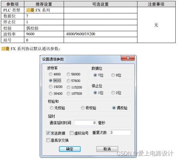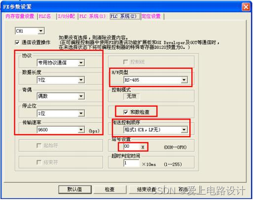 注:三菱软件奇偶校验默认为“奇数”,但和信捷 HMI 通讯时,一定要把“奇数”改为“偶数”;否则,即使把HMI改为“奇数”和三菱保持一致,也通讯不上,通讯参数写入PLC后需断电再上电生效。