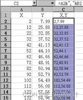 下面是一个“&”实际应用的例子。用 AutoCAD 绘图时,有人喜欢在 Excel 中存储坐标点,在绘制曲线时调用这些参数。存放数据格式为“x,y”的形式,首先在 Excel 中输入坐标值,将x坐标值放入 A列,y坐标值放入到 B列,然后利用“&”将 A列和 B列合并成 C列,在 C1 中输入:=A1&","&B1,此时 C1 中的数据形式就符合要求了,再用鼠标向下拖动 C1单元格,完成对 A列和 B列的所有内容的合并(如图2.1 与图2.2)。