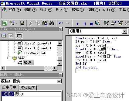 Function rrr(tatol, rr) If rr = "上班" Then rrr = 0.6 * tatol ElseIf rr = "加班" Then rrr = 0.5 * tatol ElseIf rr = "休息日" Then rrr = 0.9 * tatol End If End Function