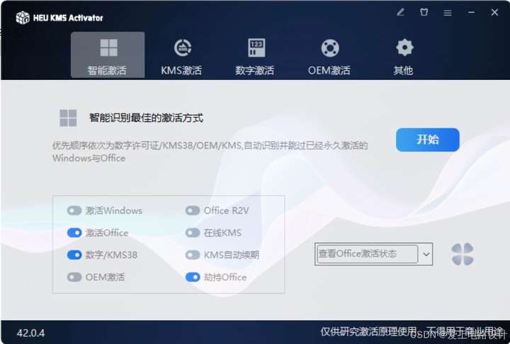运行“HEU_KMS_Activator_v42.0.4.exe”文件,选择相应选项并开始