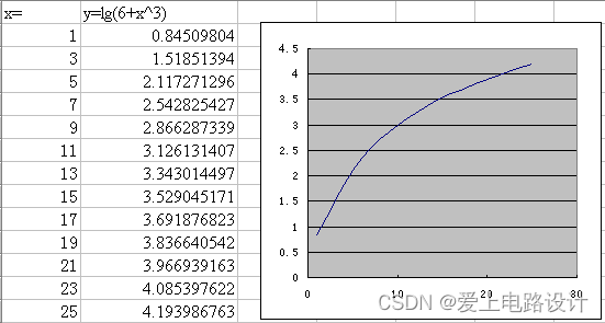 以绘制y = |lg(6+x^3)|的曲线为例,其方法如下:在某张空白的工作表中,先输入函数的自变量:在 A列的 A1格输入"X=",表明这是自变量,再在 A列的 A2 及以后的格内逐次从小到大输入自变量的各个值;实际输入的时候,通常应用等差数列输入法,先输入前二个值,定出自变量中数与数之间的步长,然后选中 A2 和 A3 两个单元格,使这二项变成一个带黑色边框的矩形,再用鼠标指向这黑色矩形的右下角的小方块“”,当光标变成"+"后,按住鼠标拖动光标到适当的位置,就完成自变量的输入。