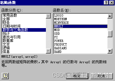 矩阵函数是Excel进行矩阵计算的专用模块。用“插入”-“函数”命令打开“粘贴函数”对话框(如图8.1),选中函数分类栏中的“数学与三角函数”,在右边栏常用的矩阵函数有: MDETERM——计算一个矩阵的行列式; MINVERSE——计算一个矩阵的逆矩阵; MMULT——计算两个矩阵的乘积; SUMPRODUCT——计算所有矩阵对应元素乘积之和。