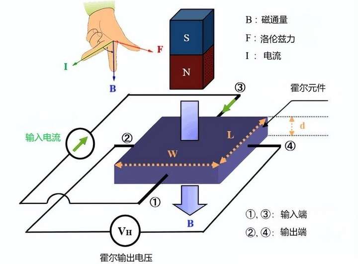 霍尔元件磁敏传感器原理是基于在电流流过的物体上施加垂直于电流的磁场时,电动势出现在与电流和磁场都正交的方向上的现象。