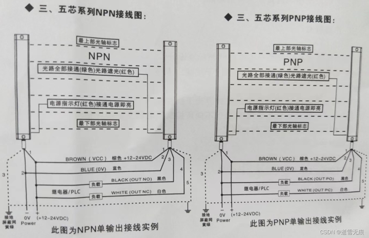 PNP 与 NPN型传感器一般有三条引出线,即电源线VCC(棕色)、0V线(蓝色)、OUT信号输出线(黑色)。